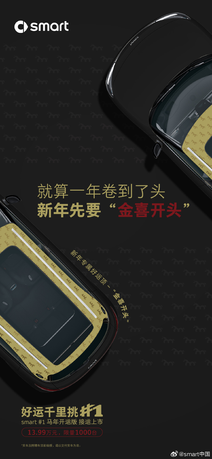 IT之家 1 月 2 日消息配资网大全,smart 精灵#1 马年开运版于 1 月 1 日上市,售价 13.99 万元,限量 1000 台。下定用户可享受好运专属礼、好运服务礼、好运置换礼和好运复购礼。
