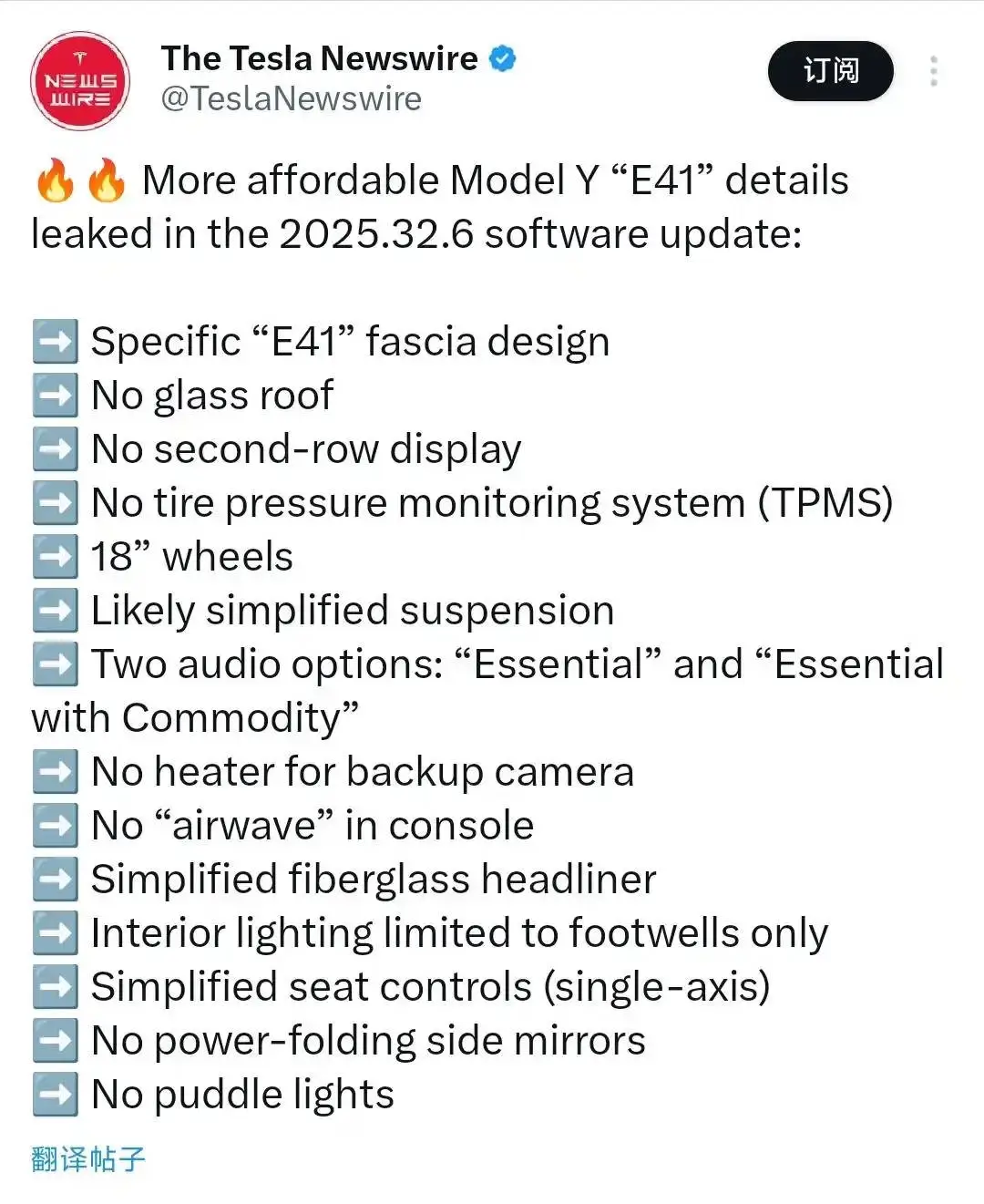 据海外博主爆料,在2025.32.6软件更新中,特斯拉泄露了“廉价版Model Y”的更多信息。根据这些信息,可以看到,这款廉价版Model Y上,很多现款车型上有的东西,都被简化掉了,玻璃车顶、轮胎压力检测系统 、电动折叠后视镜、倒车影像摄像头加热功能、可调悬架、后排控制屏等都将被取消,同时轮毂、音响系统、座椅功能、车内用料、灯光系统等方面也有简化。所以如果爆料是真的,那么这款廉价版Model Y的“简洁程度”还是令人叹为观止。
